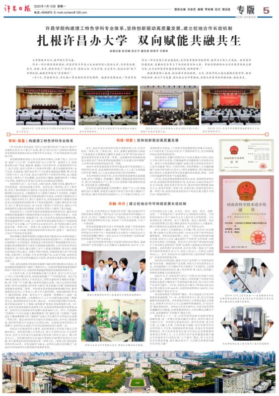2025年1月13日,《许昌日报》以《扎根许昌办大学 双向赋能共融共生》为题,深度报道了我校构建理工特色学科专业体系,坚持创新驱动高质量发展,建立校地合作长效机制,和许昌市双向赋能共融共生典型经验。全文如下:
