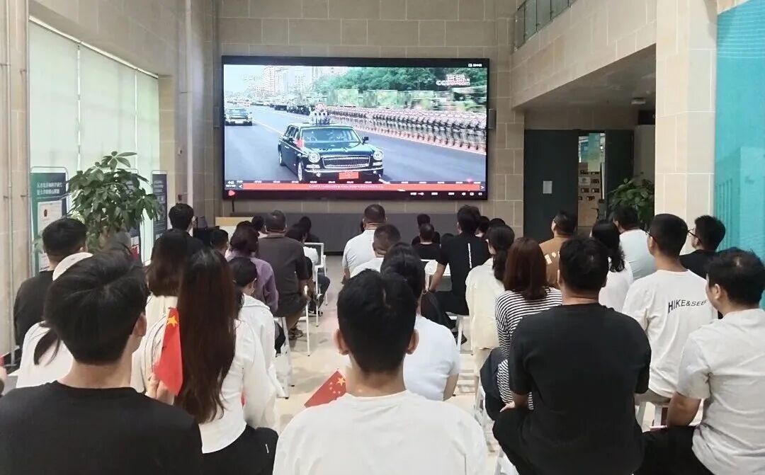 为纪念中国人民抗日战争暨世界反法西斯战争胜利80周年,进一步弘扬伟大抗战精神,厚植家国情怀,铭记历史征程,激发使命担当,大学科技园组织在孵企业员工在科技园一楼大厅集中观看了阅兵式现场直播,共同见证这一振奋人心的辉煌时刻。