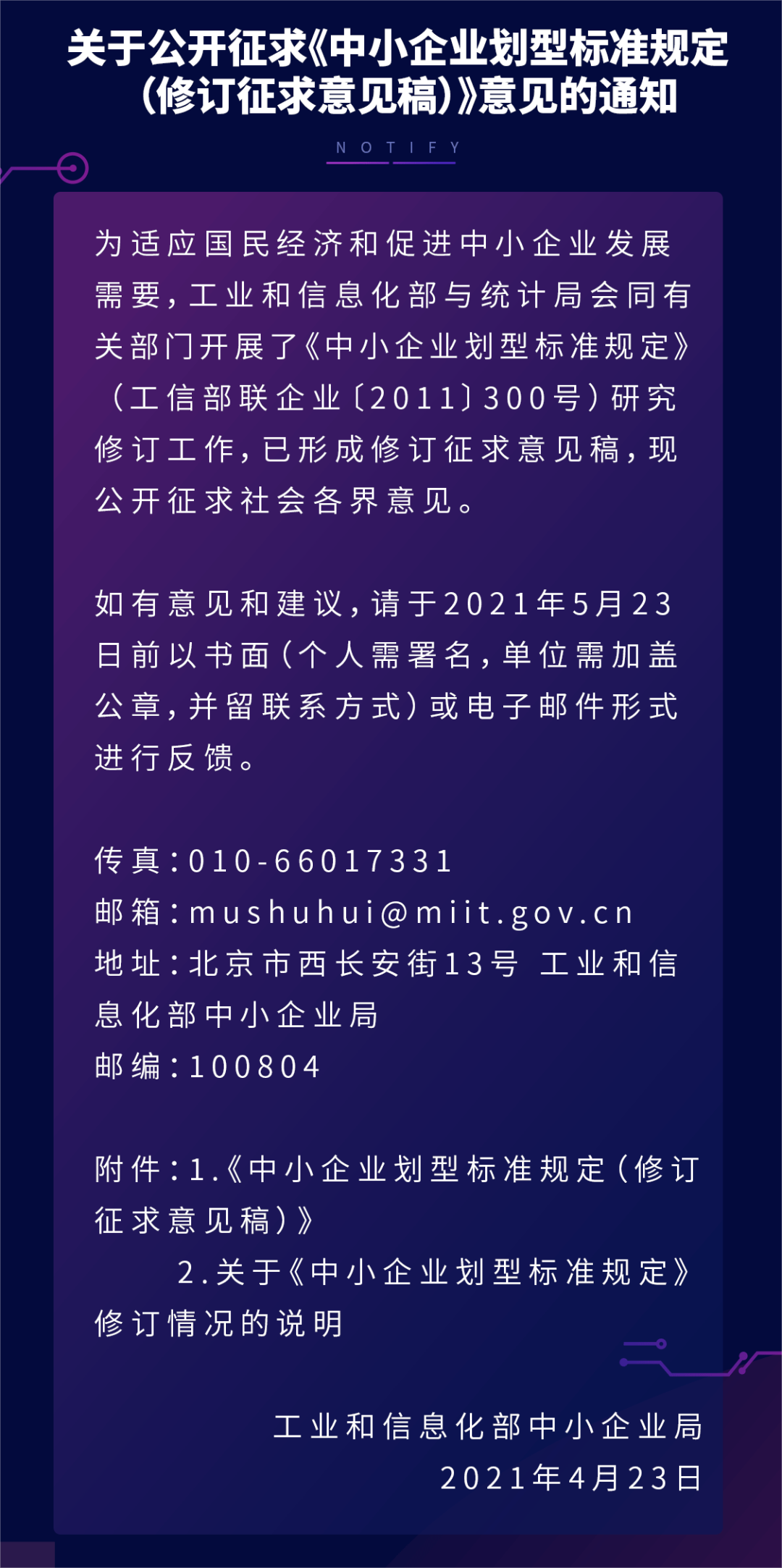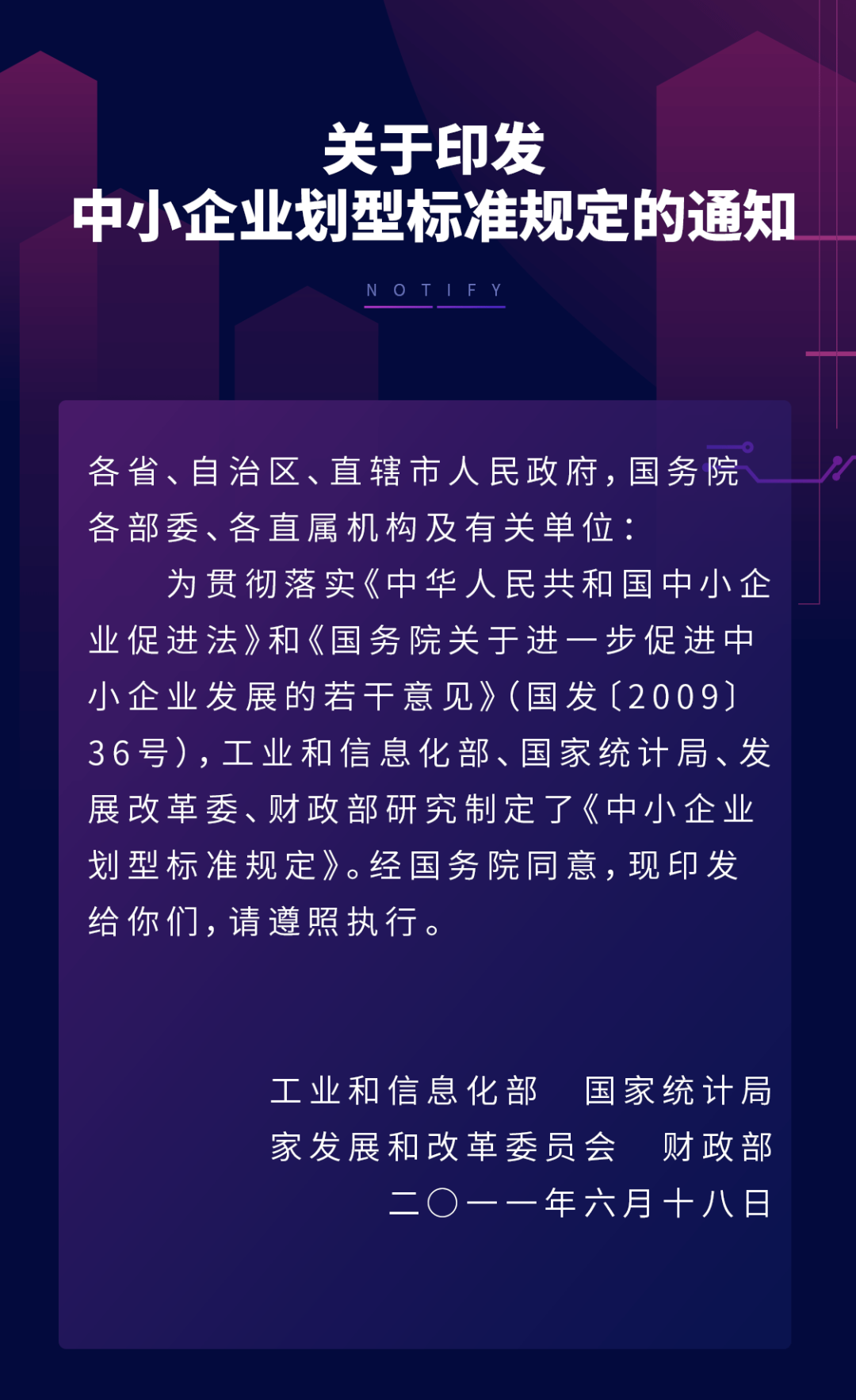 二、中小企业划分为中型、小型、微型三种类型,具体标准根据企业从业人员、营业收入、资产总额等指标以及企业控股等情况,结合行业特点制定。