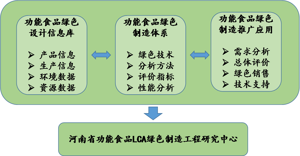 中心牵头单位为许昌学院,共建单位为河南中大恒源生物科技股份有限公司和河南金尚明蓝环境科技有限公司。中心以提高功能食品绿色设计水平为目标,在对功能食品系统全生命周期评价(LCA)分析的基础上,识别功能食品全生命周期过程中高能耗、高污染等绿色化程度不高的流程或工序,通过功能食品绿色制造推广应用平台建设,以绿色制造为核心,针对实现功能食品绿色化设计的要求,突破其生产关键技术,创建一个具有显著绿色化特征的功能食品LCA绿色制造工程研究中心,最终实现功能食品全生命周期的绿色设计与制造,使整个过程节能、降耗、环境友好,确保舌尖上的食品安全。并以此拉动功能食品绿色研发设计和绿色工艺技术一体化提升,带动功能食品工业绿色转型,提高绿色精细生产能力和产品国际竞争力。