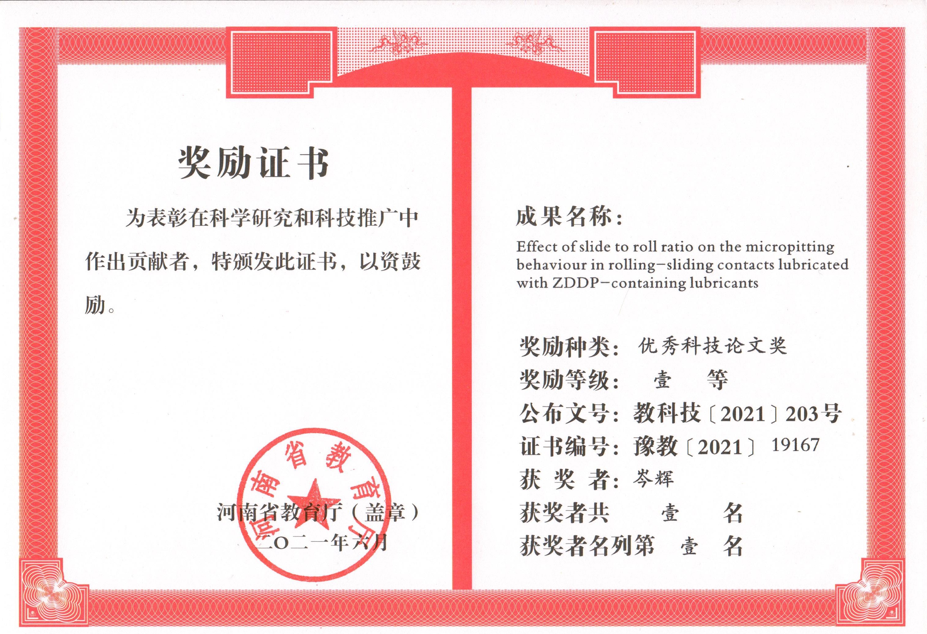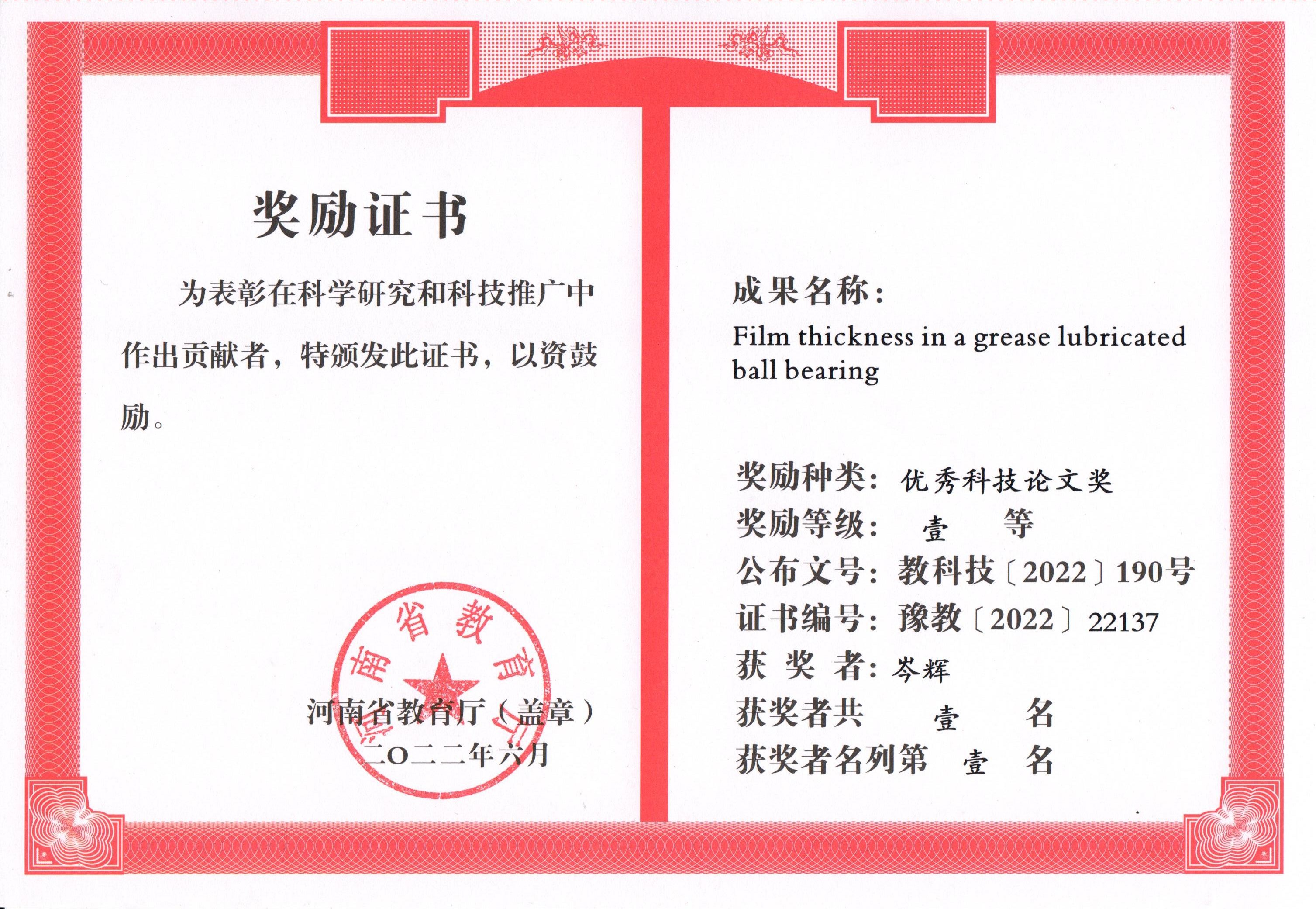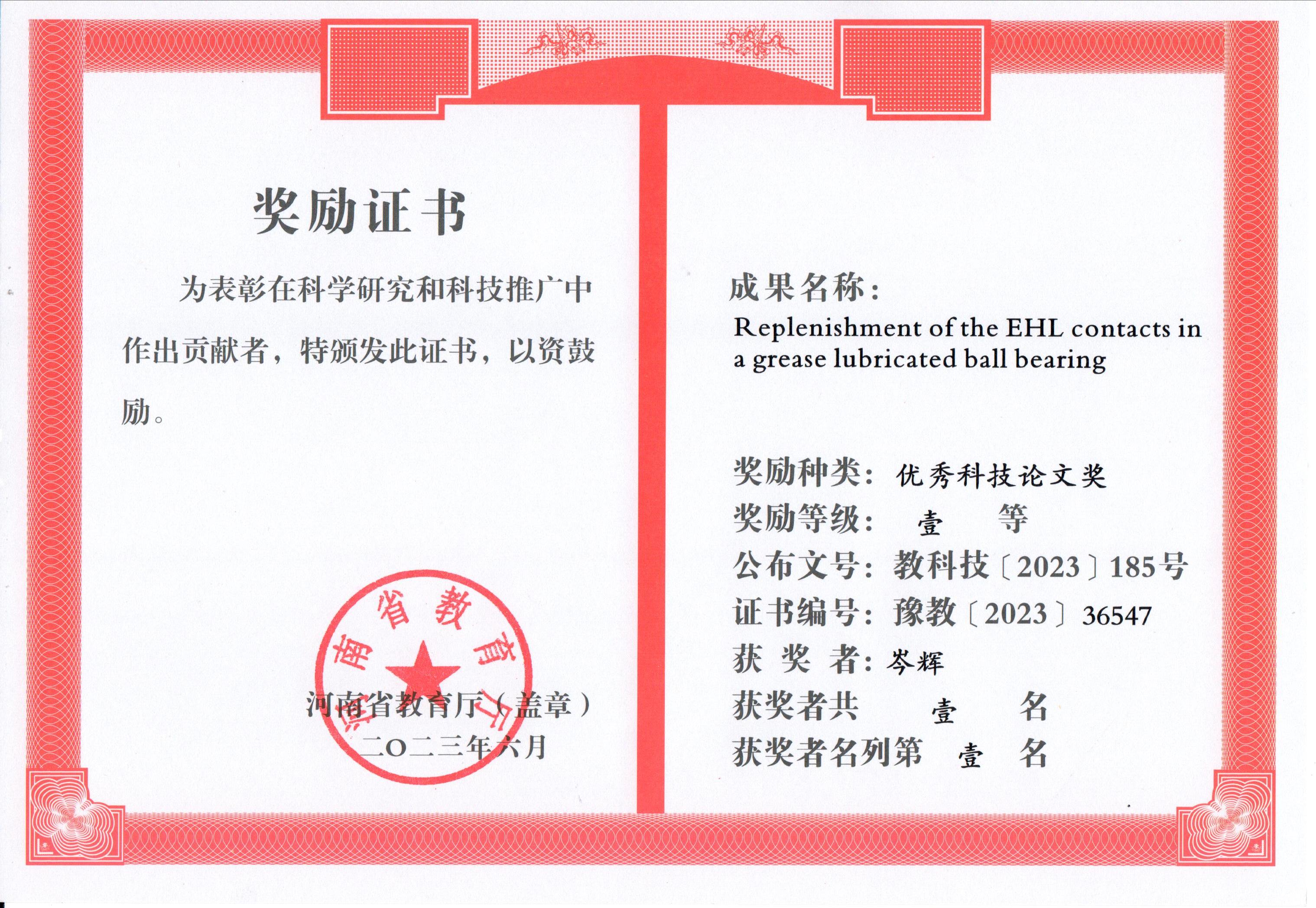 团队以围绕该研究方向发表20余篇高水平论文,其中以第一作者兼通讯作者身份发表SCI 一区(TOP期刊)收录4篇,出版学术专著1部,授权中国发明专利5项;获得美国摩擦学者与润滑工程师学会Wilbur Deutsch Memorial 奖项、河南省教育厅科技成果奖优秀科技论文奖一等奖3项。项目成果主要应用于高速轴承及其润滑剂的研发设计及其运行状态监控,具有重大经济价值,也是降低轴承运行功耗,推动轴承制造业实现“碳达峰、碳中和”目标的重要举措。