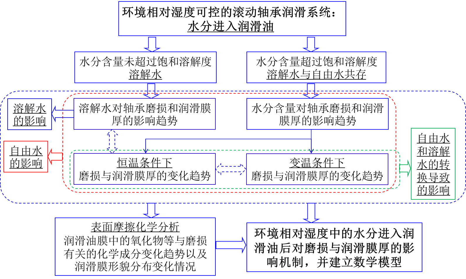 团队负责人岑辉,男,电气与机械工程学院专业教师,英国利兹大学博士,荷兰特文特大学博士后,副教授,中共党员,美国摩擦学者与润滑工程师学会高级会员,许昌市人工智能学会会长,荷兰特文特大学访问学者。团队成员包括电气与机械工程学院白丹等青年教师5名。近3年来:岑辉主持国家自然科学基金青年项目1项、参与国家自然科学基金面上项目一项、主持省部级项目3项,入选河南省高校科技创新人才、河南省高等学校青年骨干教师等省级人才项目,团队目前主要从事滚动轴承脂润滑以及相关摩擦化学方面的研究,本项目在润滑油中水分含量达到其饱和溶解度前后,对溶解水、自由水以及两者共存时对磨损和润滑膜厚的影响趋势进行研究,从而揭示环境相对湿度中的水分进入滚动轴承润滑系统后对其磨损和润滑膜厚的影响机理。本项目研究环境相对湿度中的水分进入滚动轴承润滑系统后对其产生的影响时,将润滑油中的水分状态区分为溶解水和自由水,研究两种状态的水分及其动态转换对滚动轴承的磨损和润滑膜厚的影响,并以此为基础,研究摩擦学界所争论的水分对摩擦副的不同影响。本项目利用一种流体状态监测传感器测量润滑油对水的相对饱和溶解度(溶解水含量),并采用电容法对滚动轴承动态绝对含水量以及润滑膜厚进行测量,从而得到不同状态水分以及其相互转换对滚动轴承的磨损和润滑膜厚的影响趋势,进而建立预测环境相对湿度中的水分进入滚动轴承润滑系统后与其磨损和润滑膜厚关系的数学模型,为揭示相对湿度对滚动轴承润滑系统的影响机制提供直接依据,具体夫人技术路线如图所示。