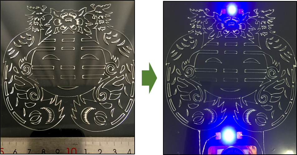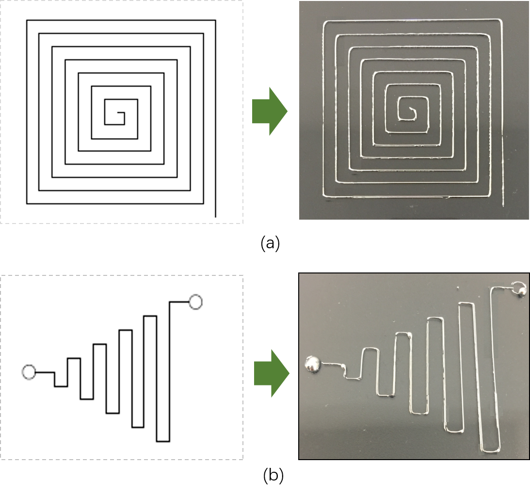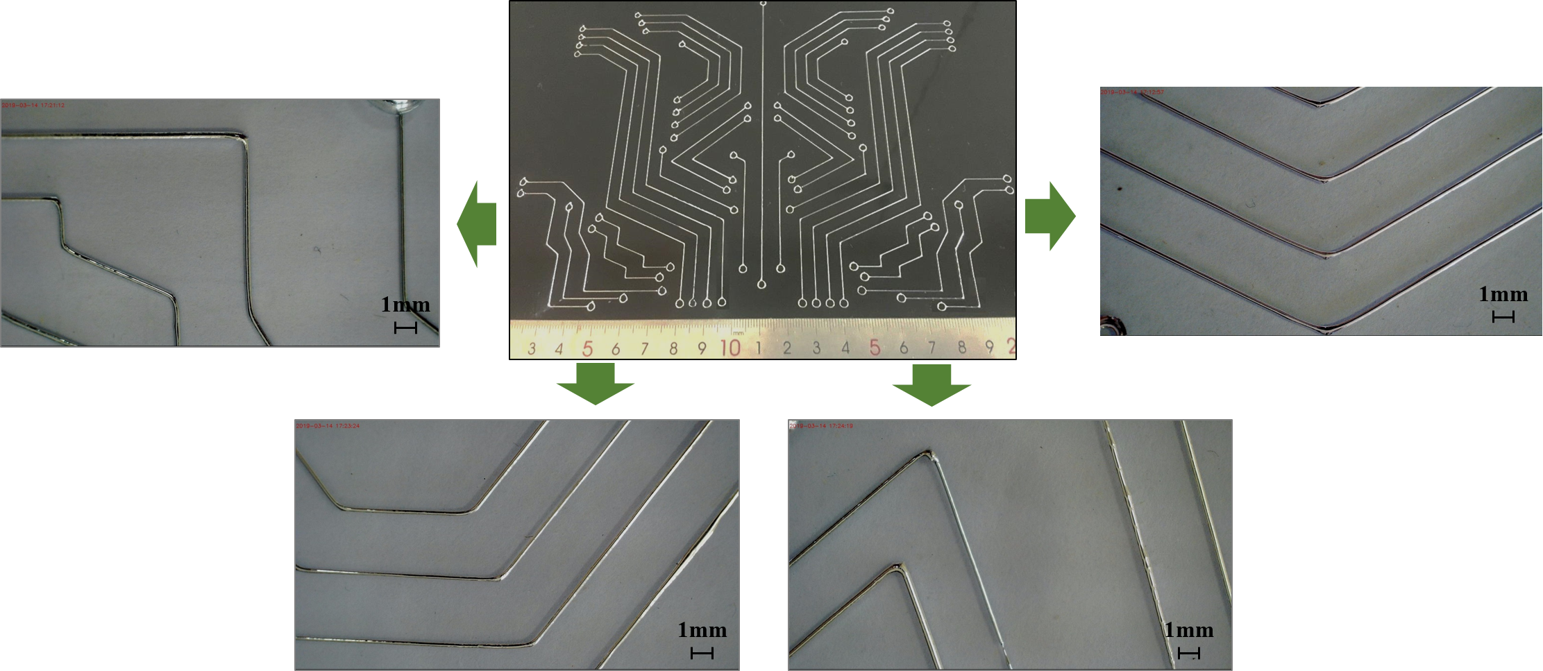 (3)柔性电路液态金属直写打印技术成果,可应用于复杂大面积柔性 PCB、电学传感器、电子艺术、电子装饰、电子化建筑设计、人物肖像、电路单元、电子贺卡、电子图案乃至功能电子器件等的即时打印和制作。这种立等可取的个性化电子制造模式除了将对传统电子工程学带来观念性变革外,也将为科学与艺术、人文、教育、文化创意等的交叉融合创造全新的机遇。