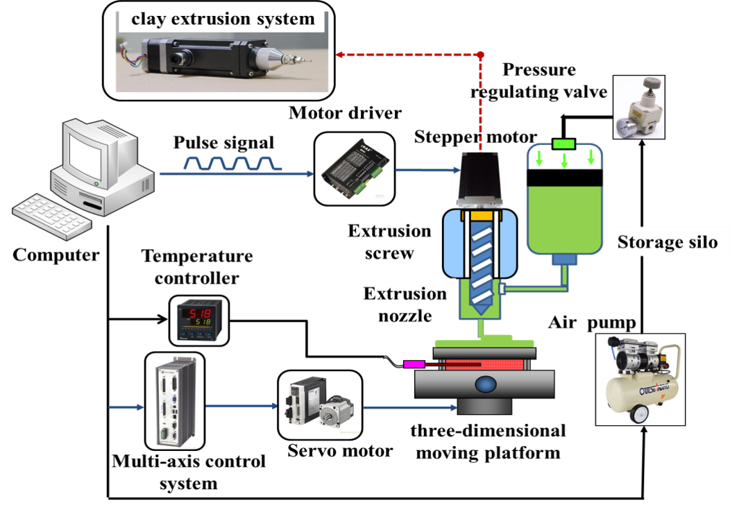 (2)电推送料螺旋挤出陶泥3D打印技术